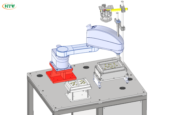- Robot xử lý: robot SCARA hút linh kiện và đặt chính xác vào khay theo loại.